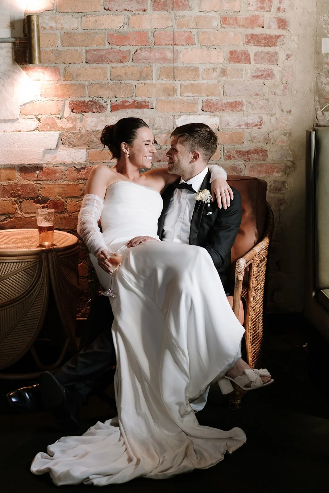 Elise’s 100% silk Crêpe de Chine gown is draped in romantic Italian tulle. The sheer tulle also wraps around her arms to create the removeable sleeves, finishing in a button-up cuff. The skirt, designed to accentuate her figure, cascades to the floor, culminating in a stunning train adorned with silk-covered buttons. For the reception, we created a playful yet elegant mini gown in a matching fabric and style for Elise to dance the night away.